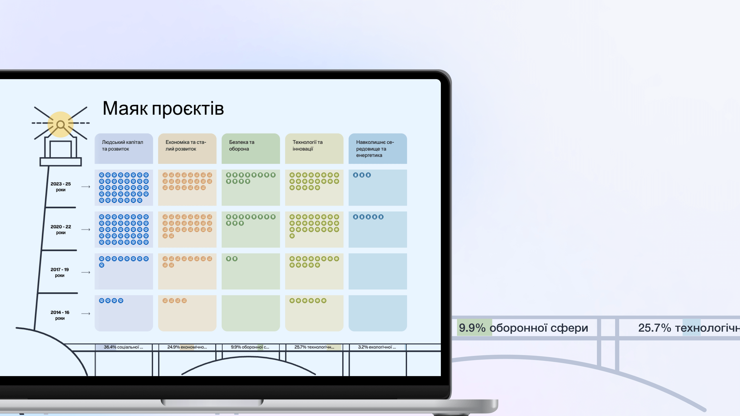 This is an informative and interactive block on the main page of the website. The task was to display all Ukrainian projects (250 in total) within a single block — categorized by implementation areas and arranged along a timeline (2014–2025).