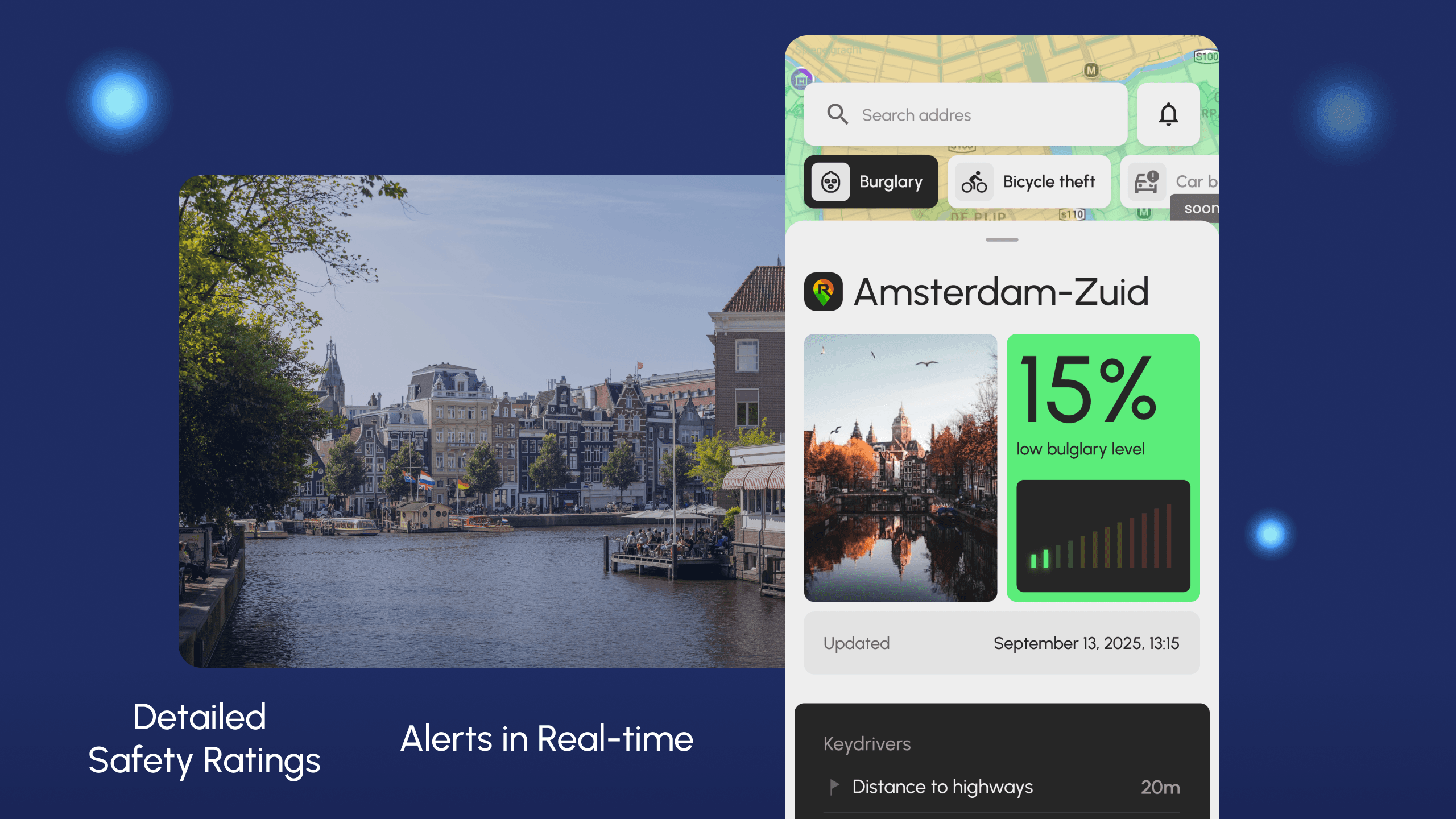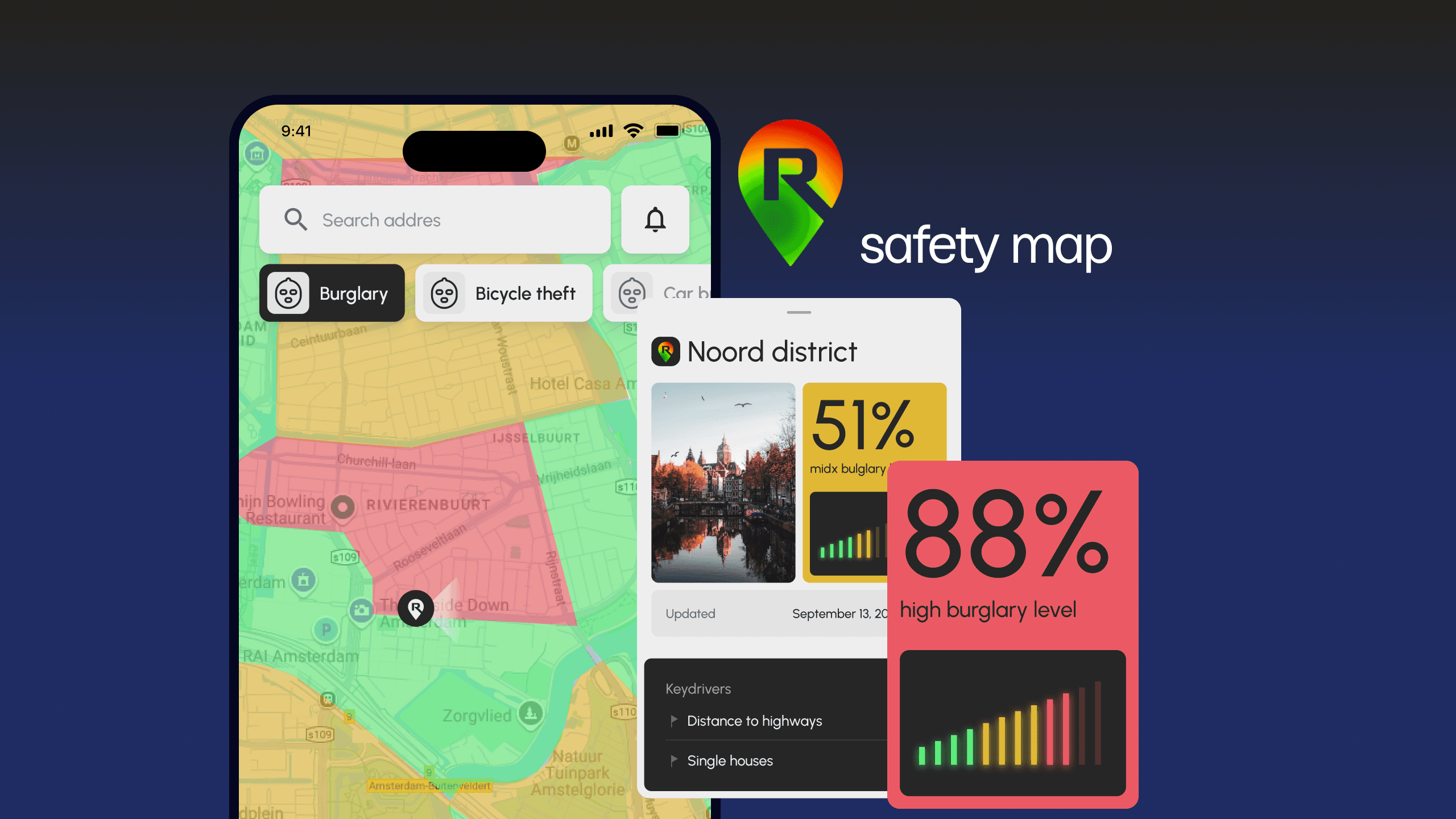 Users receive real-time alerts when entering high-risk zones (burglary or bike-theft zones). Risk levels are calculated using verified government data, police reports, and AI models trained on multi-factor criteria.